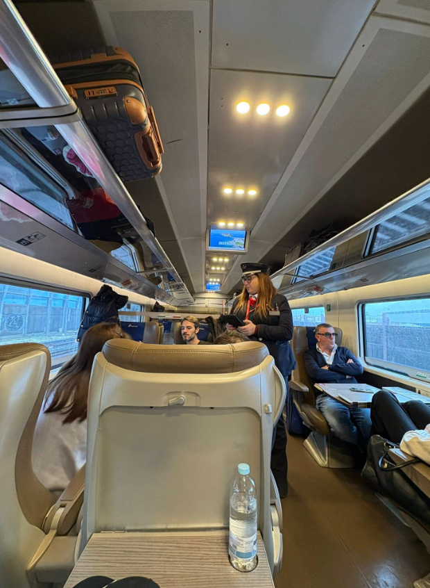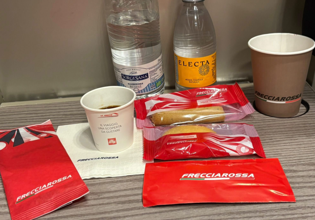 FRECCIAROSSAの中はこんな感じ。ちょっといいクラスでいったのでお菓子とかお水とかコーヒーサービスあり。