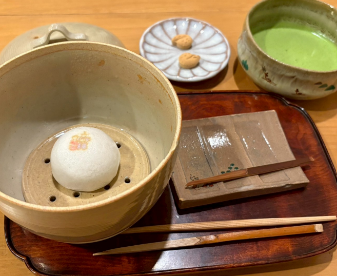 古い古民家のおしゃれなお茶やさんで 饅頭食べた